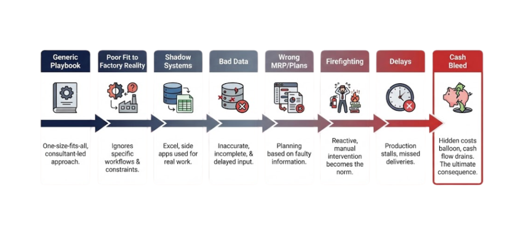 Because failure is usually adoption + workflow mismatch, not features. If teams keep running the factory in spreadsheets and side systems, the ERP becomes a reporting tool—not an operating system.