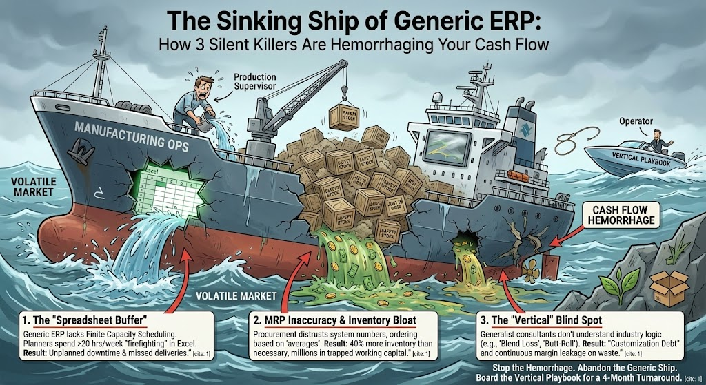 Pentagon calls this the cash flow hemorrhage—the slow drain that happens when you commit to a long, generic ERP implementation that can’t match how manufacturing actually runs in unstable markets.